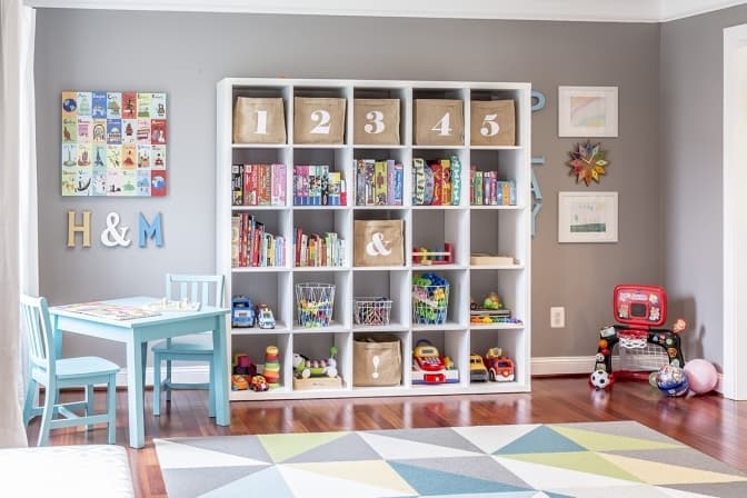 - Стелаж для іграшок: дитяча кімната завжди буде в порядку, якщо у вас є спеціальна конструкція для зберігання іграшок. Яскраві контейнери і відкриті полиці допоможуть дитині самостійно прибирати свої речі.