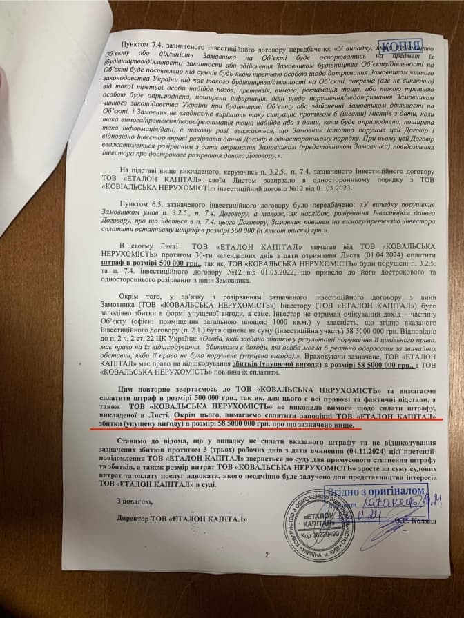 Як свідчать документи справи, компанія ТОВ «Еталон капітал» подала претензію до ТОВ «Ковальська Нерухомість» через публікації Перова у Facebook про те, що ця компанія знесла історичну будівлю на Жилянській, 47. У зв’язку з цим компанія «Еталон» розриває всі договірні зобовʼязання ТОВ «Ковальська Нерухомість» і вимагає повернути збитки (втрачену вигоду) 585 млн. грн.