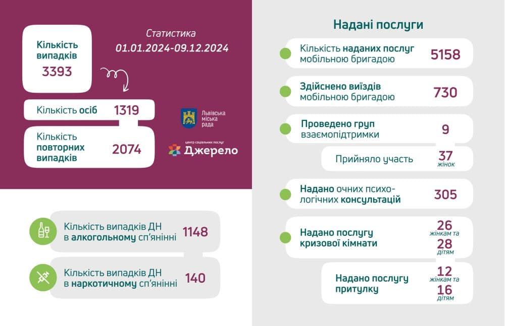 Серед усіх випадків трохи менше третини є повторними – таких цього року нарахували 1319. Мобільна бригада «Джерела» не лише фіксує звернення, але й активно працює над допомогою постраждалим. Цього року фахівці надали понад 5000 послуг, здійснили 730 виїздів, провели 9 груп взаємопідтримки, а також надали психологічні консультації 305 особам. У кризових кімнатах знайшли тимчасовий прихисток 26 жінок та 28 дітей, а в соціальному притулку – 12 жінок і 16 дітей.