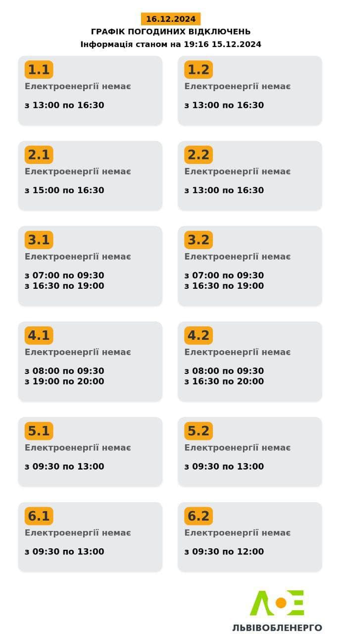 У Львові та області завтра, 16 грудня, діятимуть графіки відключень світла. Про це повідомили у Львівобленерго.