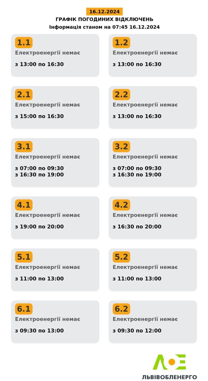 У Львові та області завтра, 16 грудня, діятимуть графіки відключень світла. Про це повідомили у Львівобленерго.