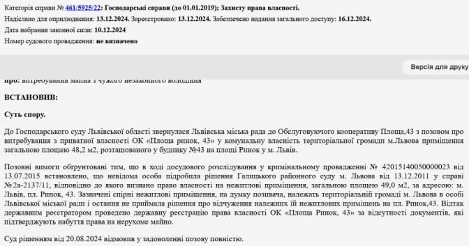 Зазначимо, що «Твоє місто» посилалося на постанову Західного апеляційного господарського суду, яке опублікували у ЄДРСР 16 грудня:
