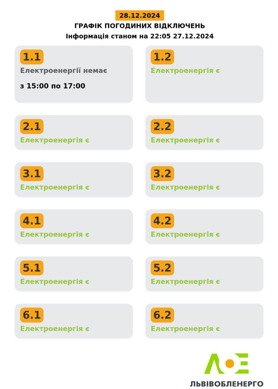 У Львові та області сьогодні, 28 грудня, діятимуть графіки відключень світла. Про це повідомили у Львівобленерго.