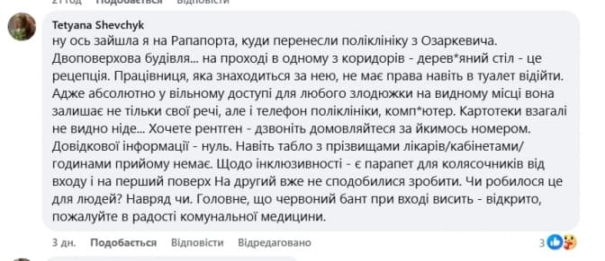 Утім, до редакції «Твого міста» надійшли звернення пацієнтів із зауваженнями щодо того, що попереднє розташування поліклініки на Озаркевича було зручнішим, а приміщення на Раппапорта не пристосоване до прийому пацієнтів.