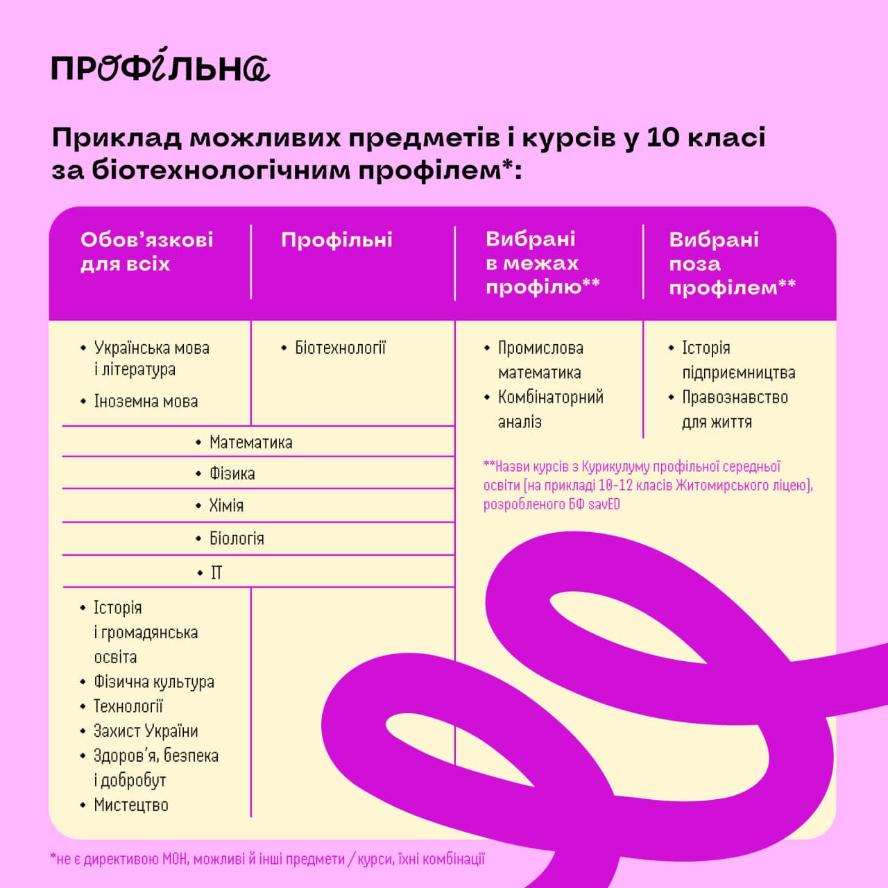 - профіль навчання - предмети й курси, які учні вивчатимуть поглиблено.
