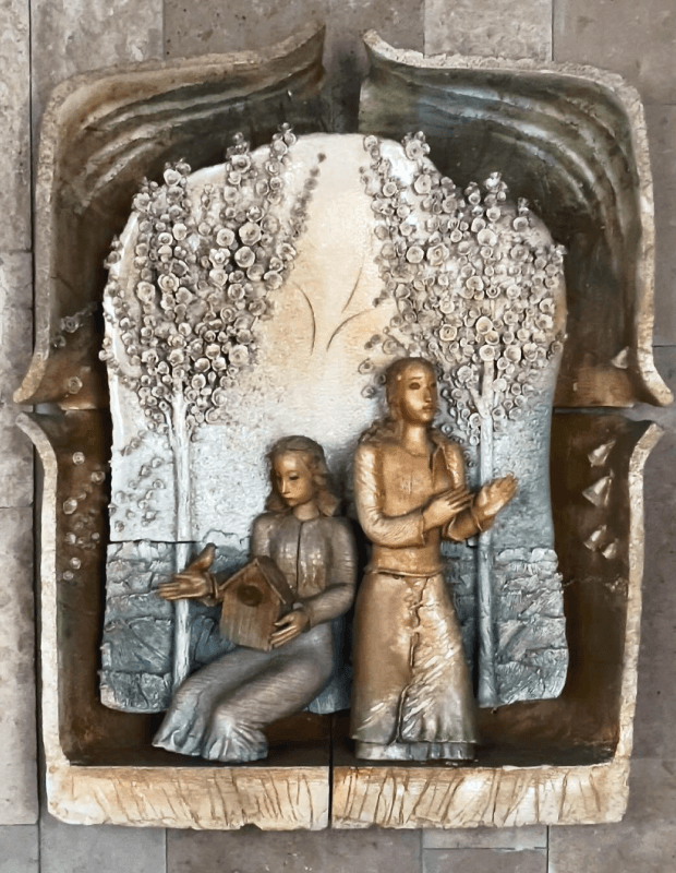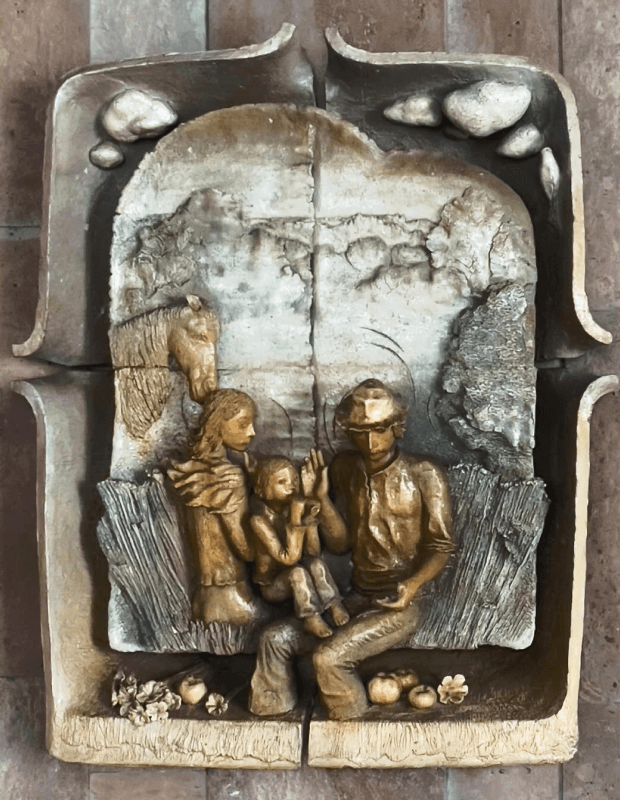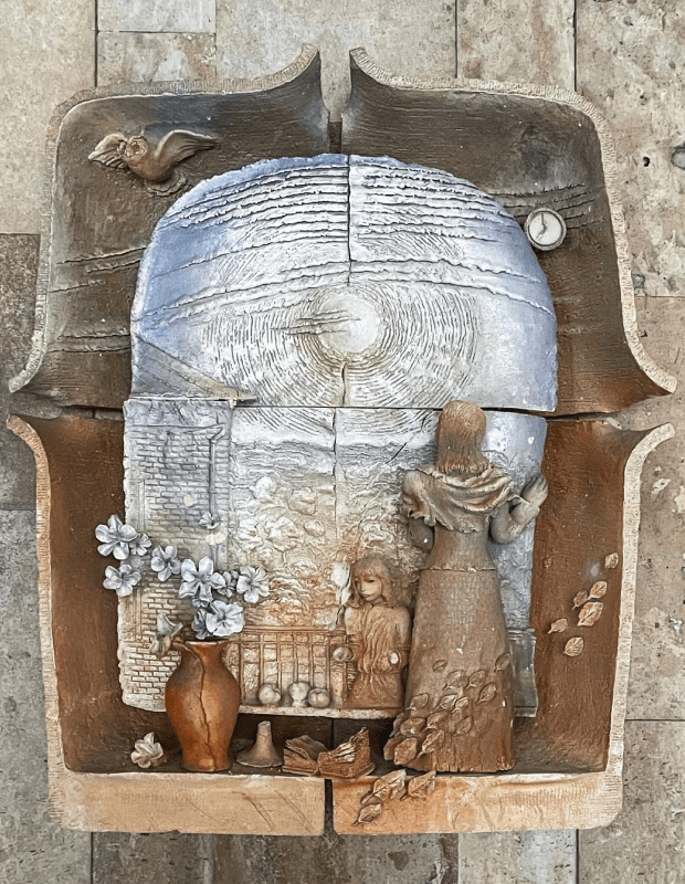 Автор скульптурної роботи Віктор Блінов створив композицію з п’яти елементів. Тривалий час лікарня не працює і авторська керамічна робота була у занедбаному стані.