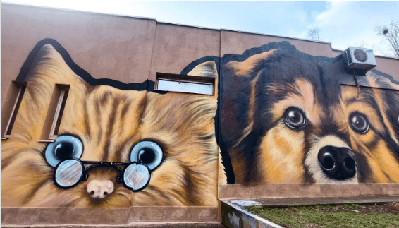 5. У Києві з’явився новий мурал від авторки скандального стінопису з поцілунком. Цього разу малюнки з’явились на фасаді притулку для тварин, щоб привернути до нього увагу.
