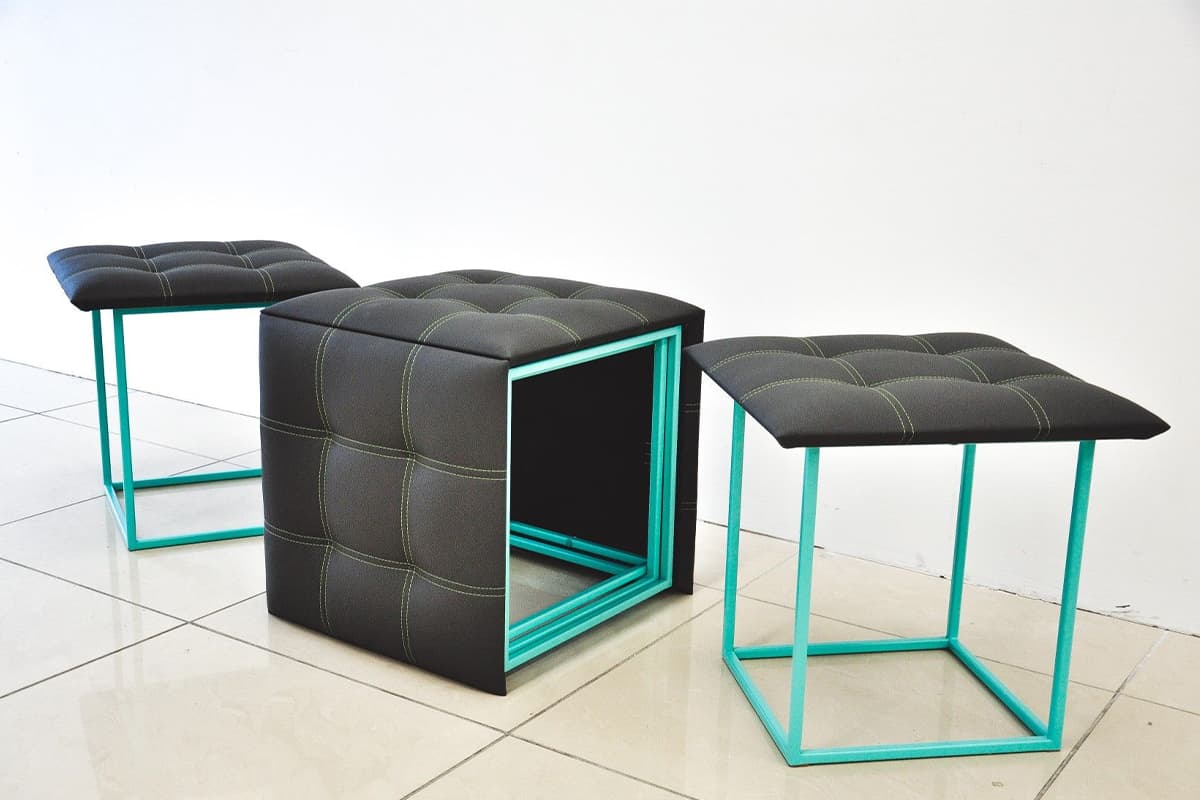 Принцип роботи такого пуфа простий: він складається з п'яти частин, які щільно з'єднані між собою. Завдяки спеціальному механізму, кожну частину можна легко витягнути і отримати окремий табурет. У складеному вигляді всі частини компактно складаються одна в одну, займаючи мінімум місця.