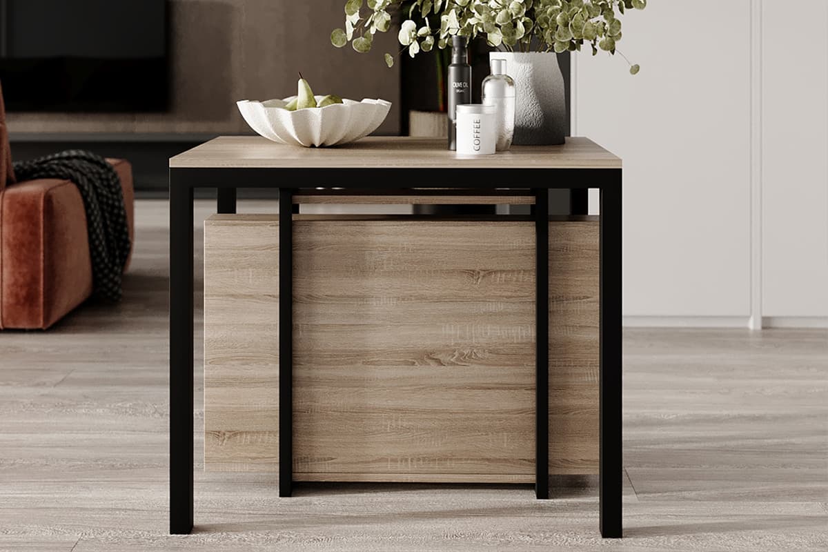 Стіл-трансформер, як і диван 3 в 1, змінює свою форму та розміри. Завдяки механізмам трансформації, розкладний стіл-трансформер перетворюється з компактного журнального столика на великий обідній або робочий стіл.