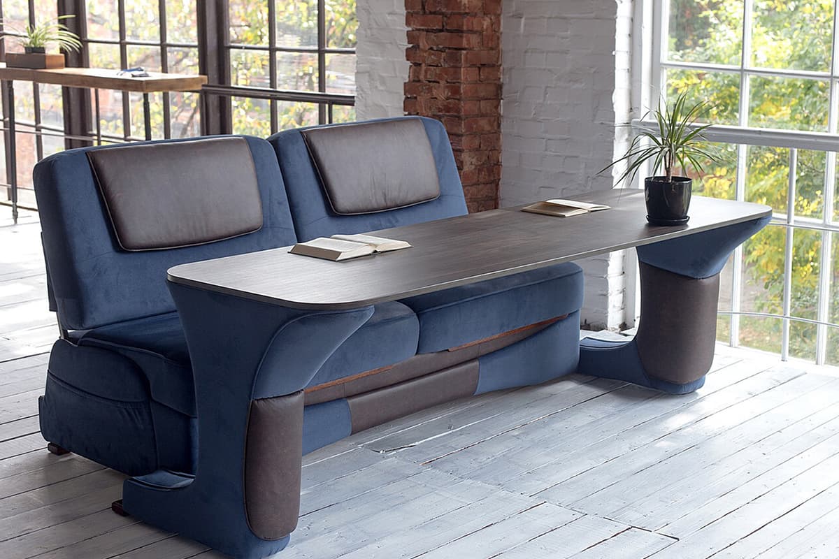- Диван-стіл. Ідеальний варіант для невеликих кухонь або віталень. Диван легко перетворюється на великий обідній стіл.