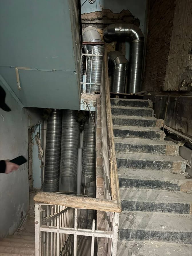 Він пише, що в будинку демонтували частини капітальних стін, поглибили підвал. Також у дворі встановили незаконну металеву прибудову, а в середині під'їзду на сходових клітинах прокладають вентиляційні труби.