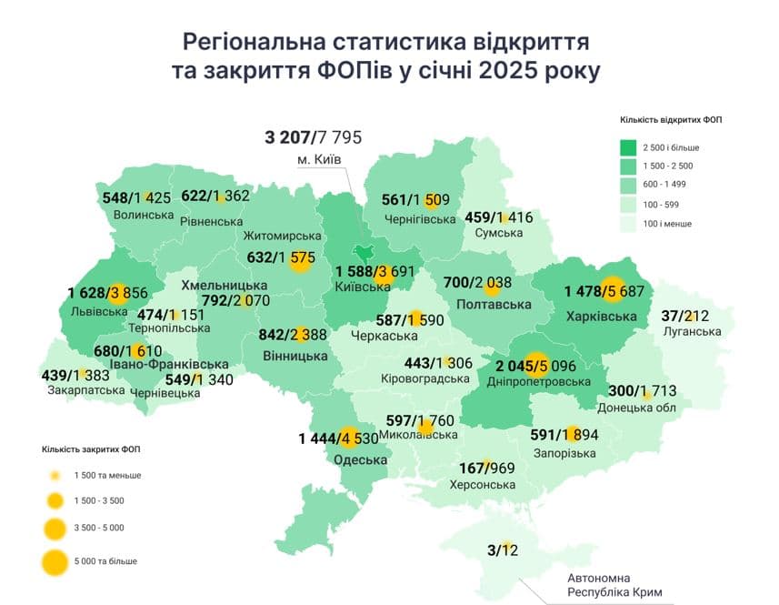 Зазначають, що після відновлення роботи Єдиного державного реєстру (ЄДР) у січні 2025 року було зареєстровано 21,4 тис. нових ФОПів. Водночас припинили діяльність 59,4 тис. підприємців, що є найбільшим показником за останній рік. Чистий відтік бізнесу склав 38 тис. ФОПів.