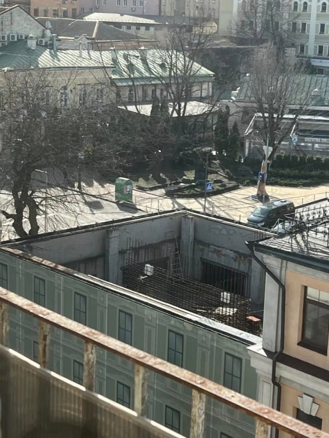 За словами Перова, півтораповерхову споруду затягнули будівельною сіткою з намальованим фасадом, за яким виявився каркас нової бетонної будівлі.
