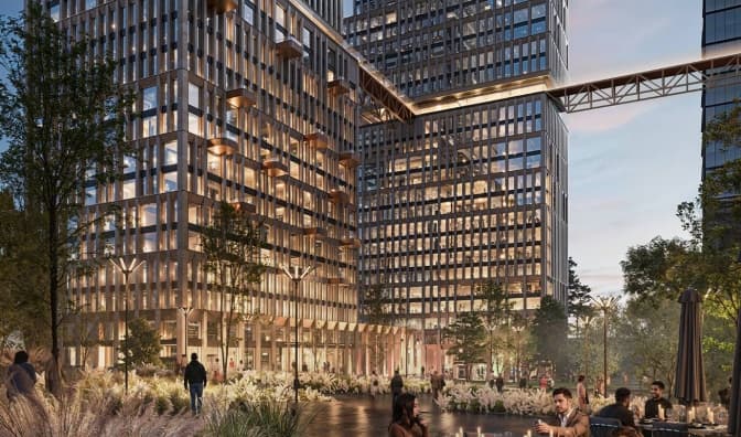 Новий ЖК складатиметься з дев’яти будинків заввишки від 14 до 29 поверхів. Візуалізації показують басейни на дахах і міст між будинками.