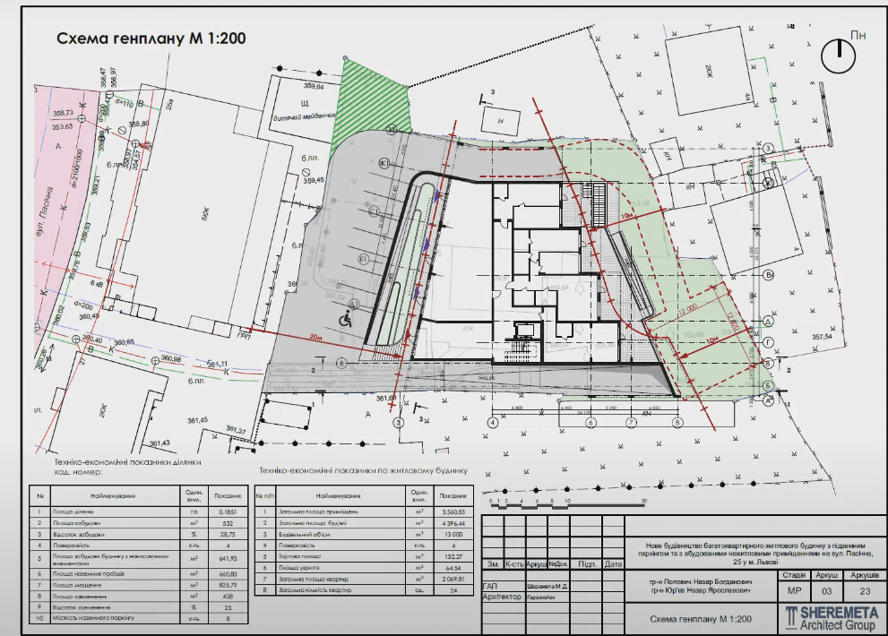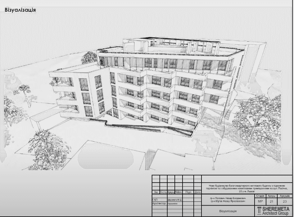 Архітектор проєкту Микола Шеремета повідомив, що ділянка розміщена в зоні Ж-1, де допустима житлова забудова не має перевищувати чотири поверхи. В будинку буде підземний паркінг, який слугуватиме і як укриття, а з північної сторони планують облаштувати дитячий майданчик, який буде продовженням існуючого на сусідній ділянці. На даху розглядають можливість облаштування басейну з перголами.