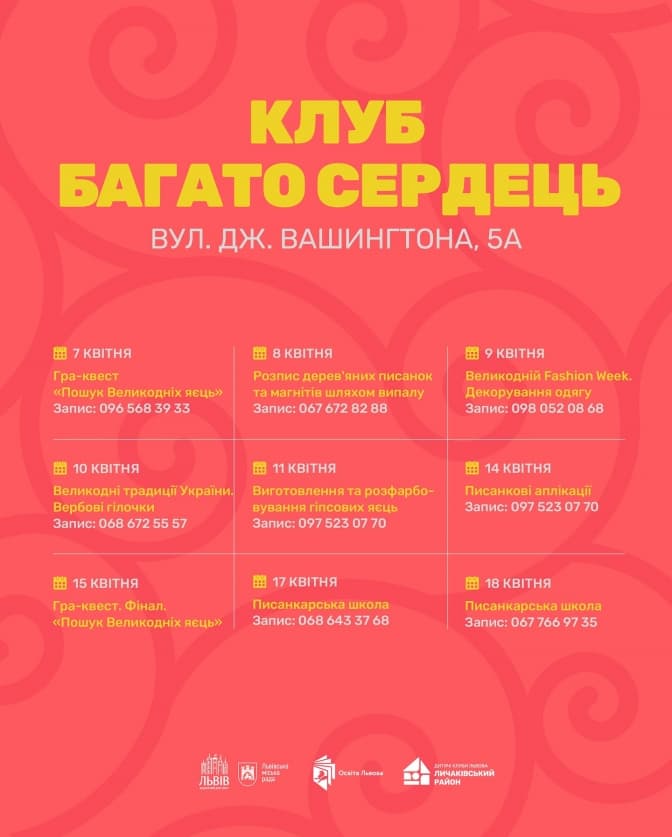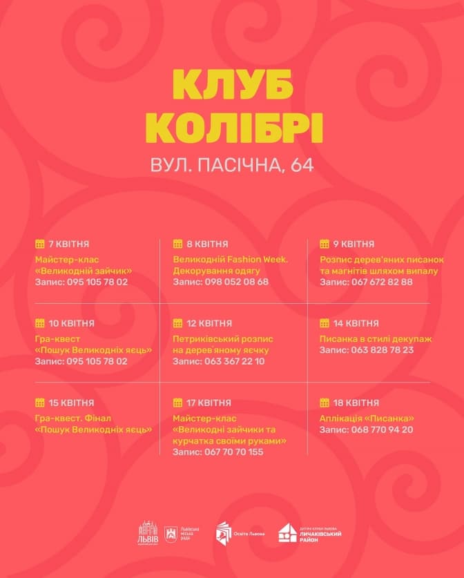 «Запрошуємо поринути в атмосферу Великодня та спробувати себе в різних творчих майстер-класах на 4-ох локаціях. В кожному клубі ми розмістили скриньки, куди можна зробити благодійний донат. Усі зібрані кошти будуть спрямовані на підтримку нашого педагога та його 117-ї механізованої бригади», – йдеться у повідомленні.