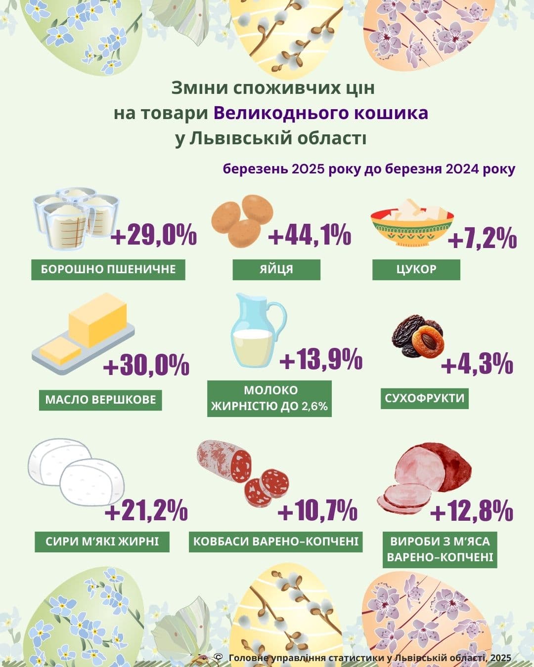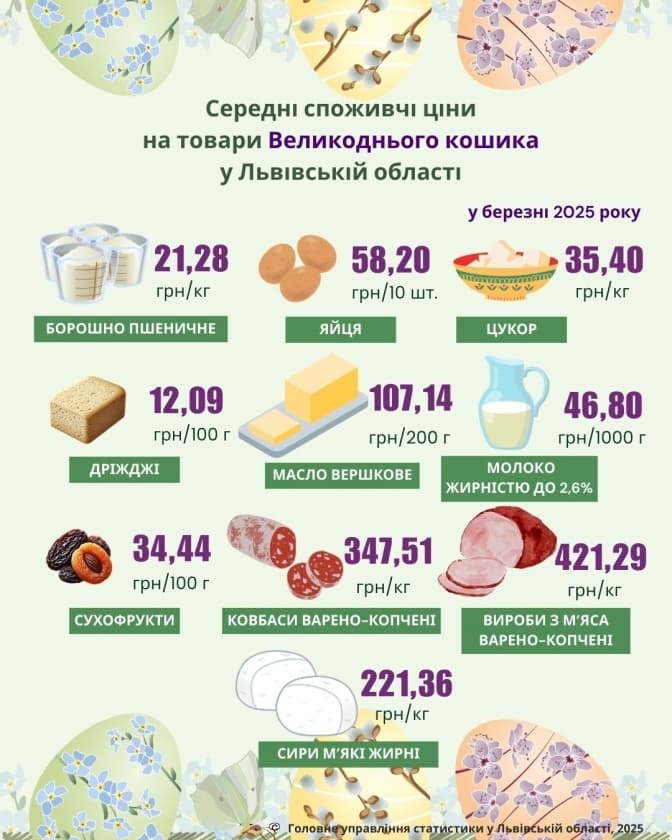 У березні 2025 року Головне управління статистики у Львівській області оприлюднило середні споживчі ціни на основні складники Великоднього кошика. Вартість більшості продуктів зросла порівняно з березнем 2024 року.