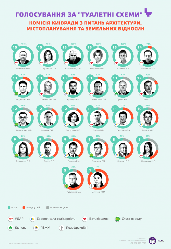 Заступниця голови земельної комісії Олена Овраменко (УДАР), яка публічно заперечувала підтримку «схем», голосувала за всі 15 рішень. Екс-ОПЗЖ – Ігор Кириленко і Юлія Уласик – також підтримали всі 15 рішень. А Юлія Симуніна голосувала лише один раз «за», решту засідань пропустила.