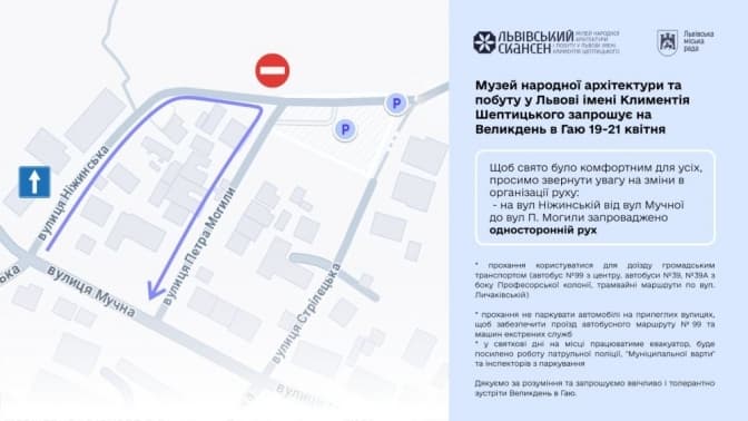 Із п’ятниці, 18 квітня, біля Музею народної архітектури та побуту імені Климентія Шептицького змінюють організацію дорожнього руху. У дні великодніх заходів тут очікують наплив відвідувачів. Щоб уникнути заторів і забезпечити доступ для спецтранспорту та громадського транспорту, у районі скансену впровадили нову схему. Про це повідомляє пресслужба ЛМР.