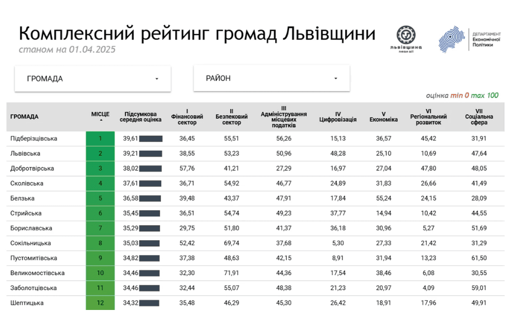 Детальніше з рейтингом можна ознайомитись за посиланням: Комплексний рейтинг громад Львівщини.