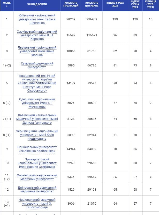 У трійку лідерів знову увійшов Львівський національний університет імені Івана Франка, який посів третє місце за індексом Гірша. Ще два львівські виші – Львівський національний медичний університет імені Данила Галицького та Національний університет «Львівська політехніка» – розташувалися відповідно на сьомій та дев’ятій позиціях. Таким чином, одразу три університети зі Львова увійшли до топ-10 рейтингу Scopus 2025 року.