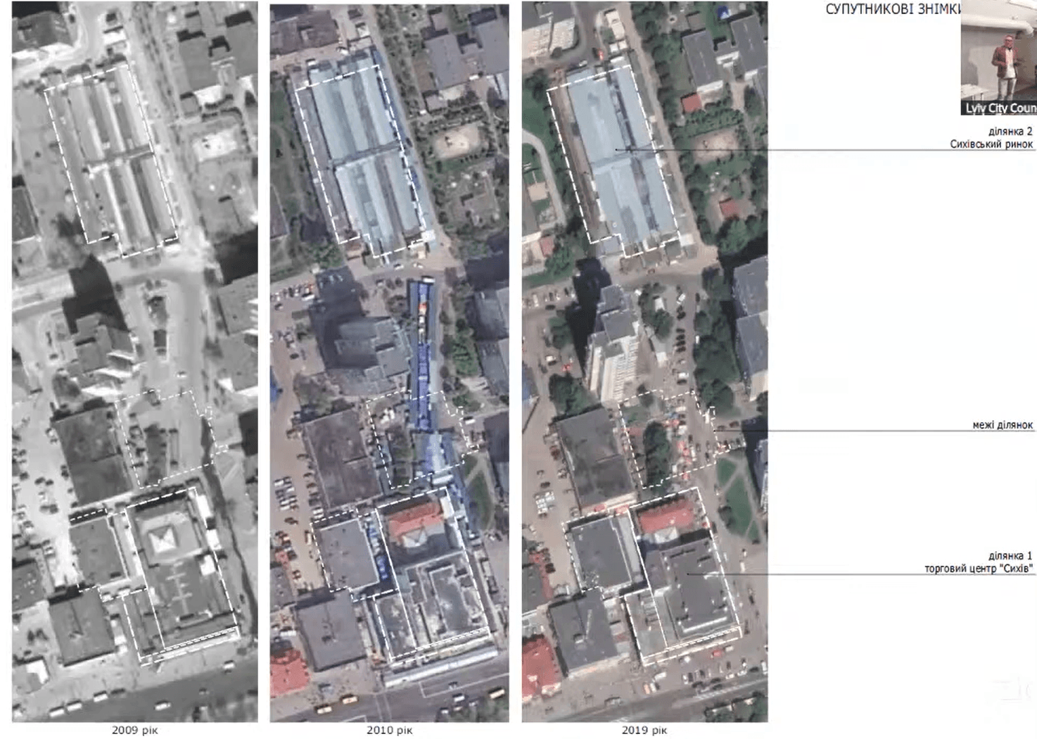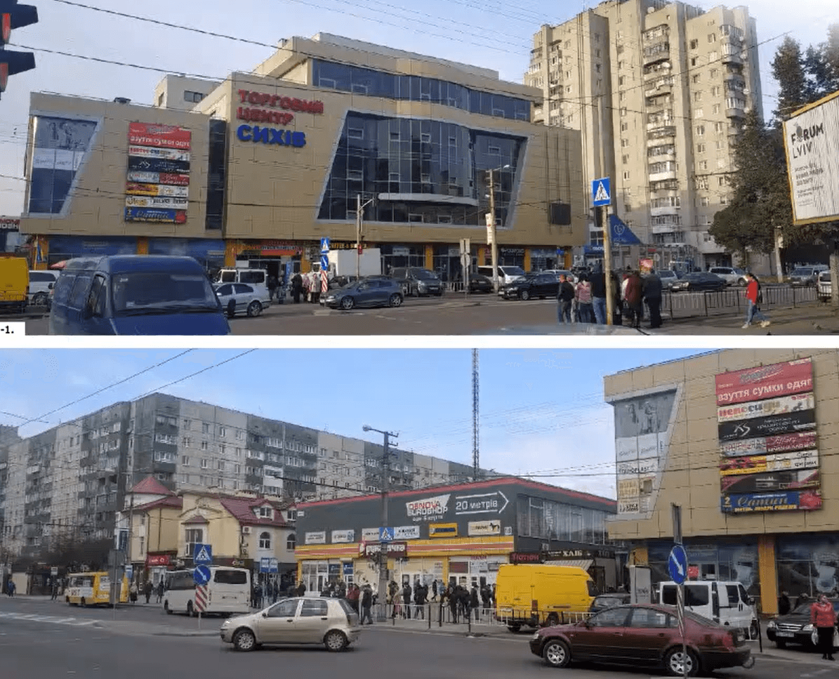Вигляд ділянки на вул. Сихівській. Зліва – 2009 рік (вже був ТЦ «Сихів», ринок, житловий будинок; фото – посередині 2010 рік – з’являється хаотична торгівля; фото справа – 2019 рік – хаотична торгівля зменшилась, частину павільйонів демонтували
