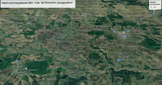 Як йдеться у відкритих даних на онлайн-платформі «ЕкоСистема», дві споріднені компанії – ТОВ «Вітропарк Західний-Р» та «Вітропарк Західний-Л», мають намір побудувати величезний вітровий парк між Львівською, Рівненською та Тернопільською областями.
