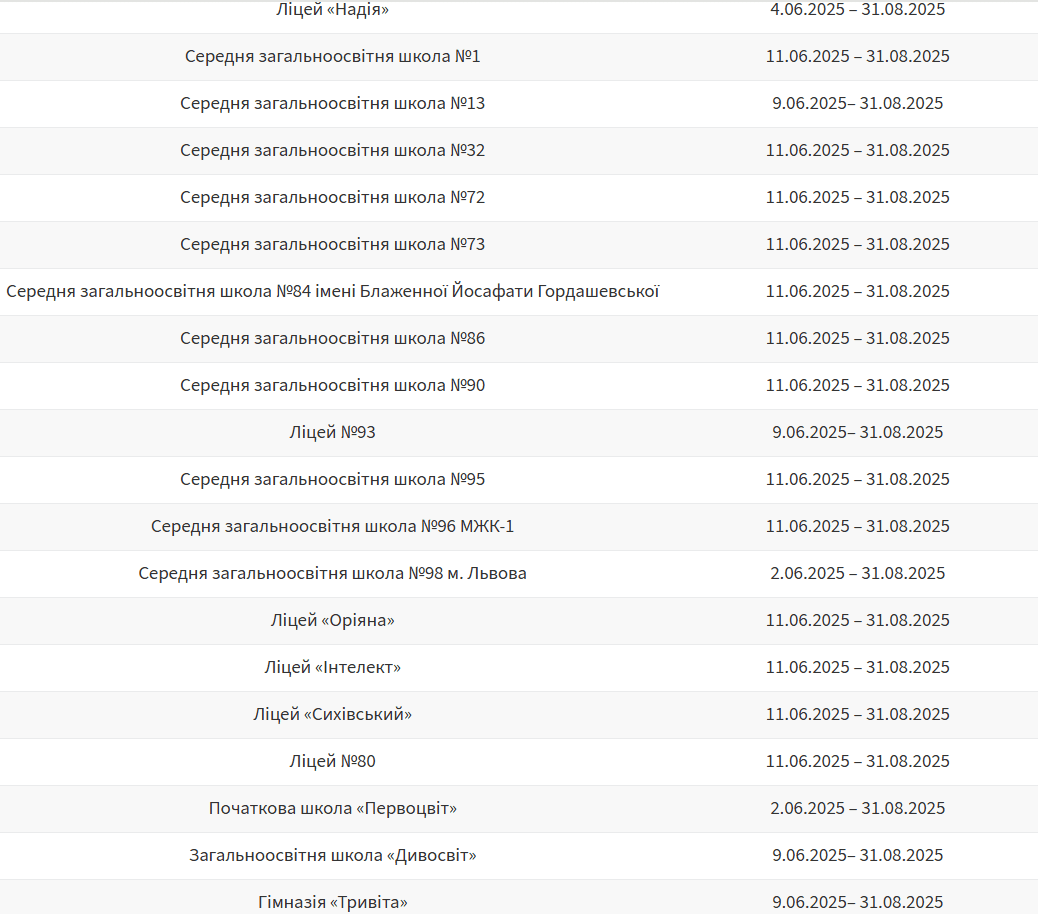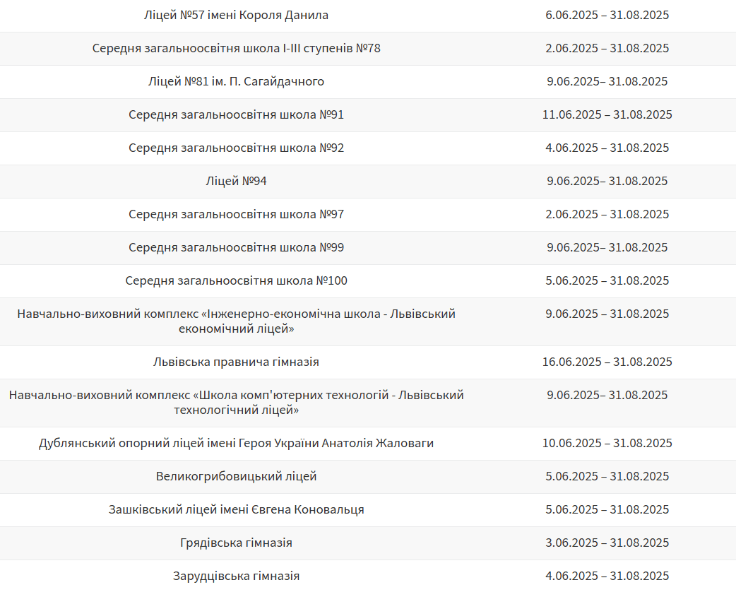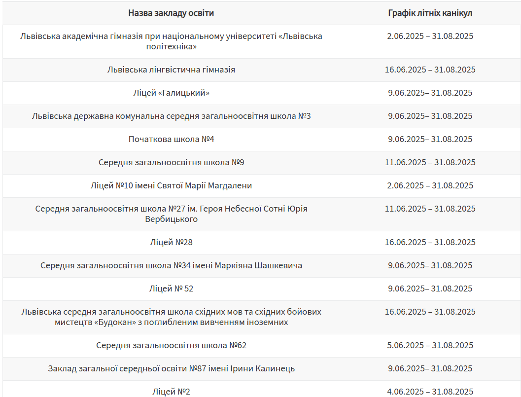 Літні канікули в більшості шкіл Львова розпочнуться в першій половині червня та триватимуть звично до 31 серпня. Водночас є заклади освіти, де завершення навчального року заплановане на середину червня. Про це повідомили в управлінні розвитку освіти Львівської міської ради.