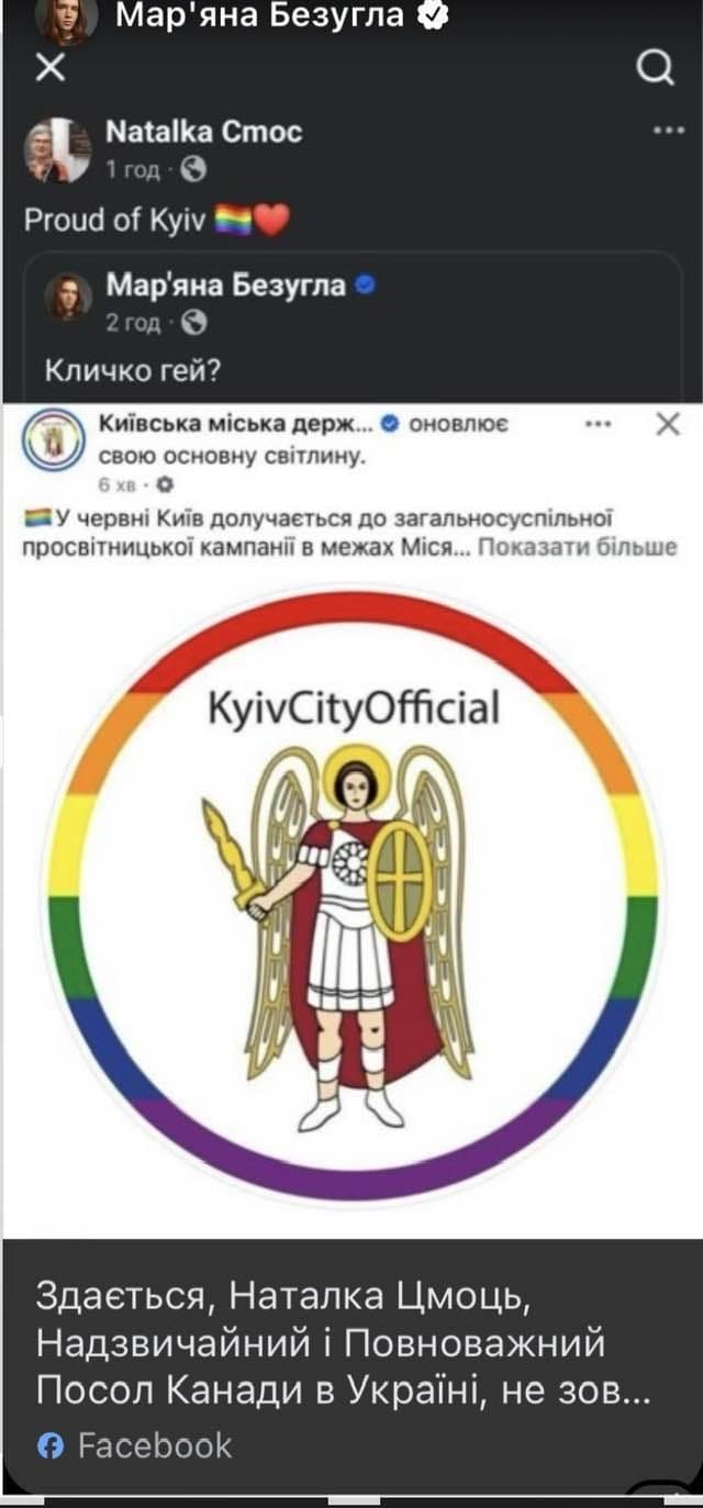 Між народною депутаткою Мар’яною Безуглою та посолкою Канади в Україні Наталкою Цмоць розгорівся публічний конфлікт у соцмережах через символіку ЛГБТ-спільноти, яку Київська міська адміністрація додала до свого герба на знак підтримки Місяця гордості.