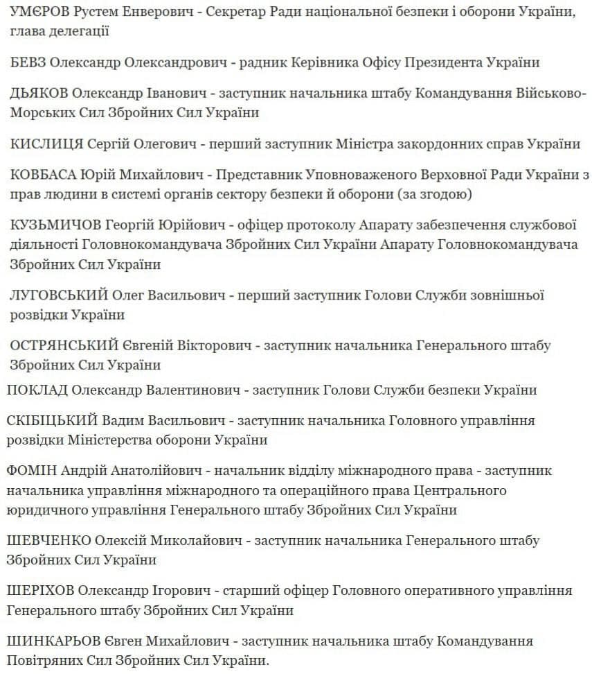 Зокрема, у делегацію включено першого заступника міністра закордонних справ Сергія Кислицю, заступника голови СБУ Олександра Поклада, першого заступника голови СЗРУ Олега Луговського, заступника начальника ГУР Міноборони Вадима Скібіцького, а також низку високопоставлених офіцерів Генштабу ЗСУ.
