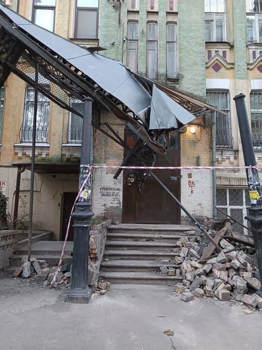 Потужний буревій у Києві пошкодив нововиявлену пам’ятку архітектури — дашок під’їзду шестиповерхового будинку Евеліни Шмідт на вул. Котарбінського, 21.
