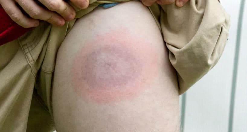 Сью Нельсон після укусу кліща в червні 2023 року звернулася до трьох лікарів, але її симптоми не пов’язали з бореліозом. Лише у США, куди вона поїхала до сина, їй призначили лікування – курс антибіотика доксицикліну. До того часу висип поширився по животу та навколо коліна.