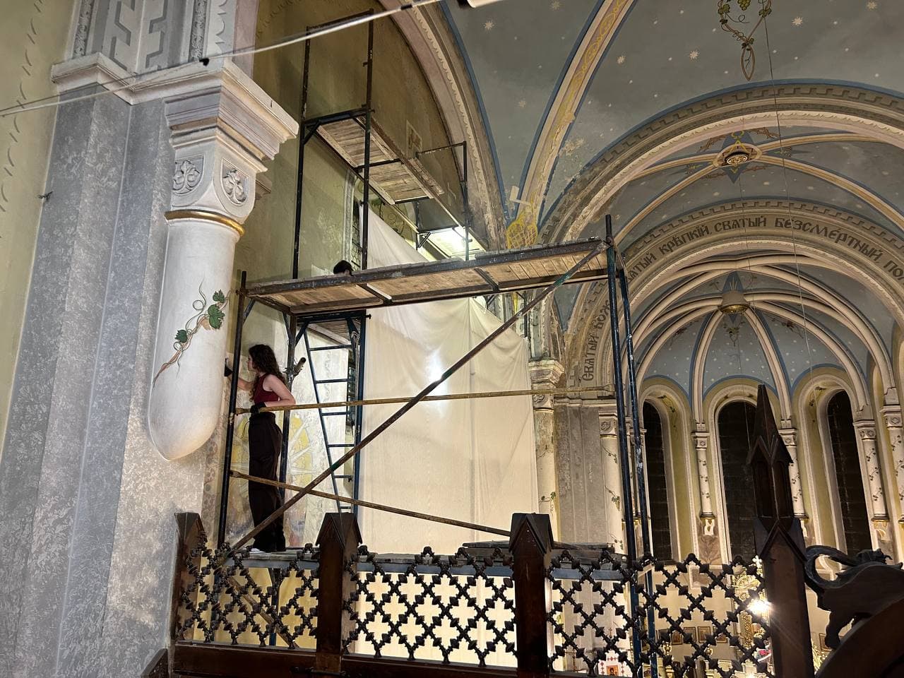 «Тут є кілька ділянок досить великих і сильно пошкоджених. У процесі подальших робіт відбуватиметься реконструкція. Відкриваються цікаві розписи Юліана Крупського початку століття, збережені в гарному стані, але покриті пізнішими набілами 1980–1990-х років. Реставрація цієї ділянки триватиме від одного до двох місяців», — зазначив художник-реставратор Андрій Почеква.