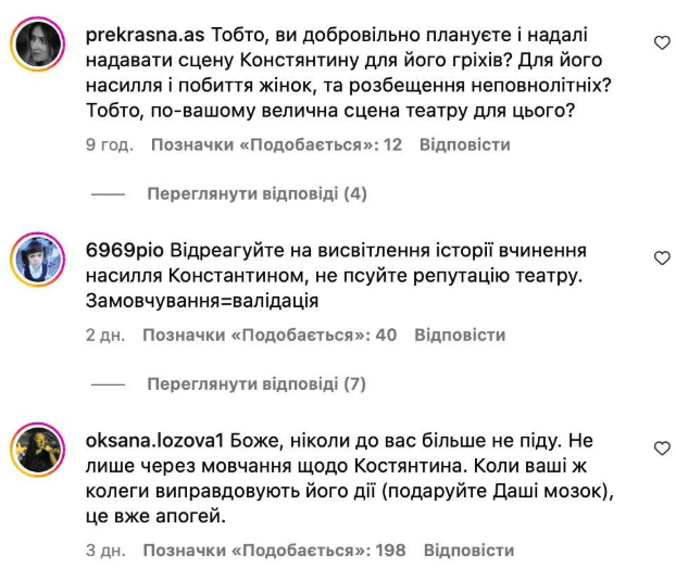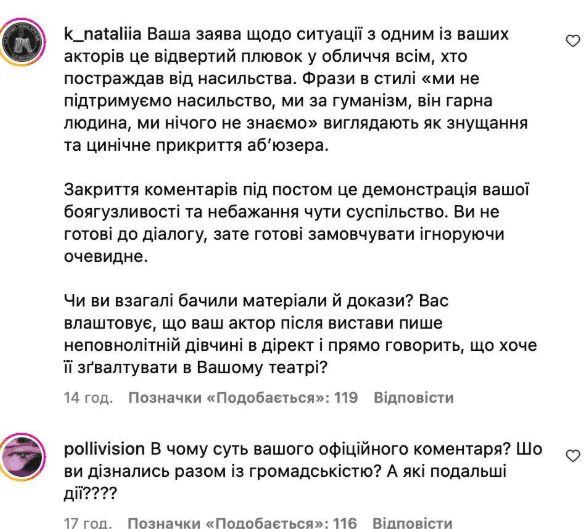 Театр має бути місцем, де формується культура, а не інституцією, яка толерує насильників, наголошують користувачі.