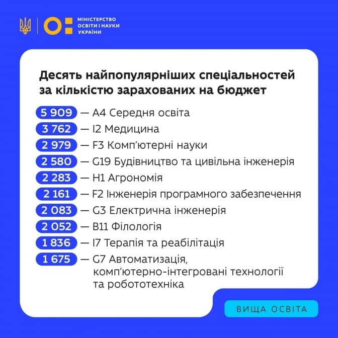Зокрема, найпопулярніші спеціальності серед зарахованих на бюджет у 2025 році можна побачити на інфографіці. Найбільший попит серед абітурієнтів мала спеціальність «А4 середня освіта».