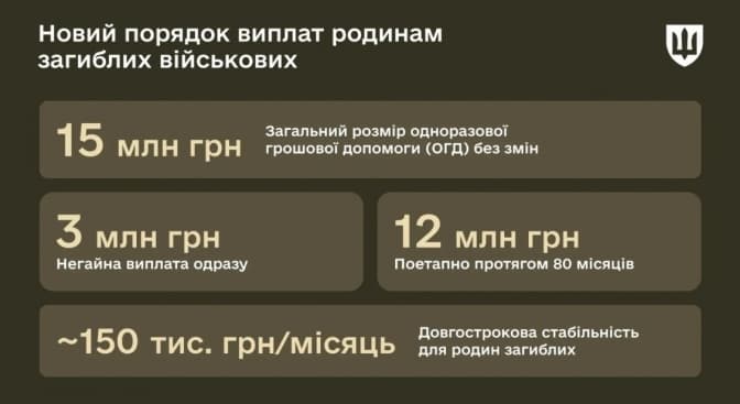 «Загальний розмір одноразової грошової допомоги залишається без змін і становить 15 млн грн. Виплата 1/5 цієї суми – 3 млн грн – здійснюватиметься негайно, а решта 12 млн грн виплачуватиметься поетапно протягом 80 місяців, що дорівнює приблизно 150 тис. грн щомісяця», – йдеться у повідомленні.