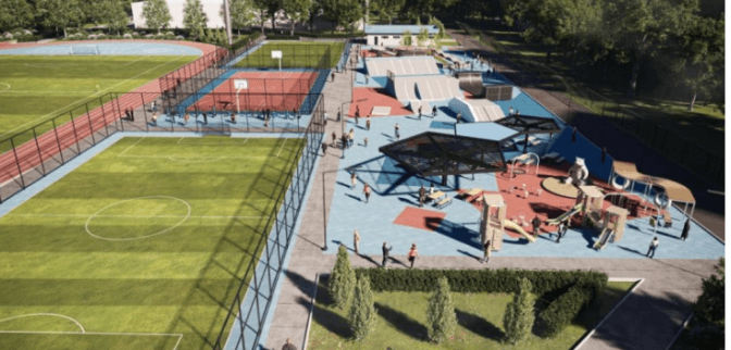 На Оболоні реконструюють шкільний стадіон одразу для ліцеїв №225 та 214: окрім футбольного поля та мінімайданчиків, комплекс включатиме урбан-парк для скейтбордингу і паркуру. Голова РДА Кирило Фесик презентував попередній проєкт нового міжшкільного стадіону на території ліцею №214.
