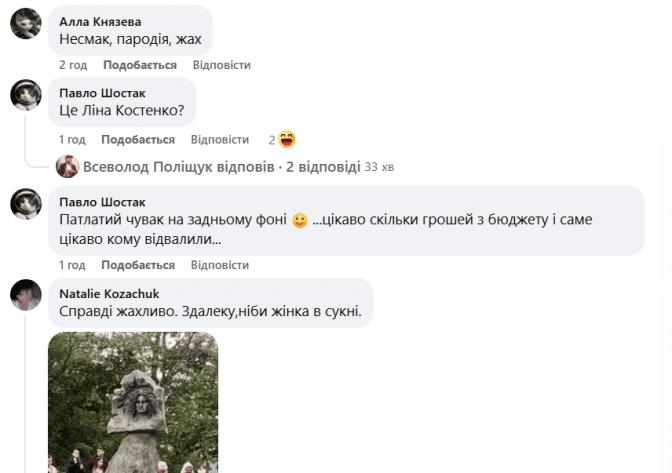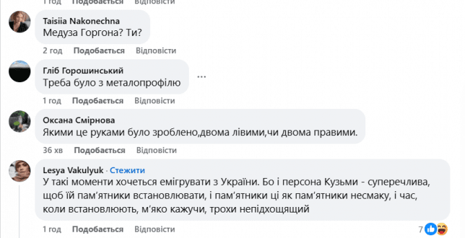 Втім, у соцмережах скульптура викликала хвилю критики. Журналістка Любов Сорокіна у своєму дописі різко висловилася щодо роботи: