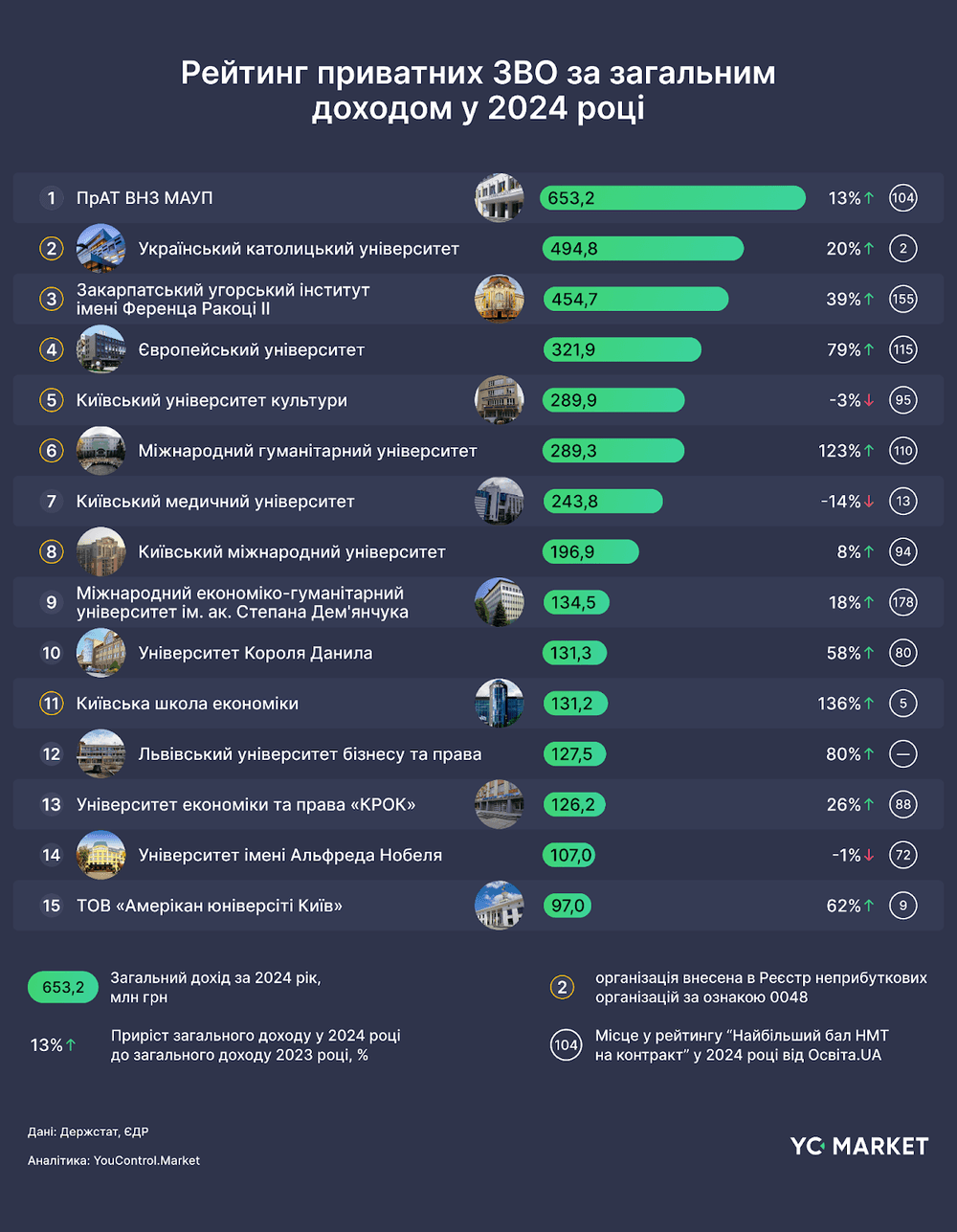 Перше місце у рейтингу посів Міжрегіональна академія управління персоналом (МАУП), яка у 2024 році отримала 653,2 млн грн доходу — на 13% більше, ніж роком раніше.