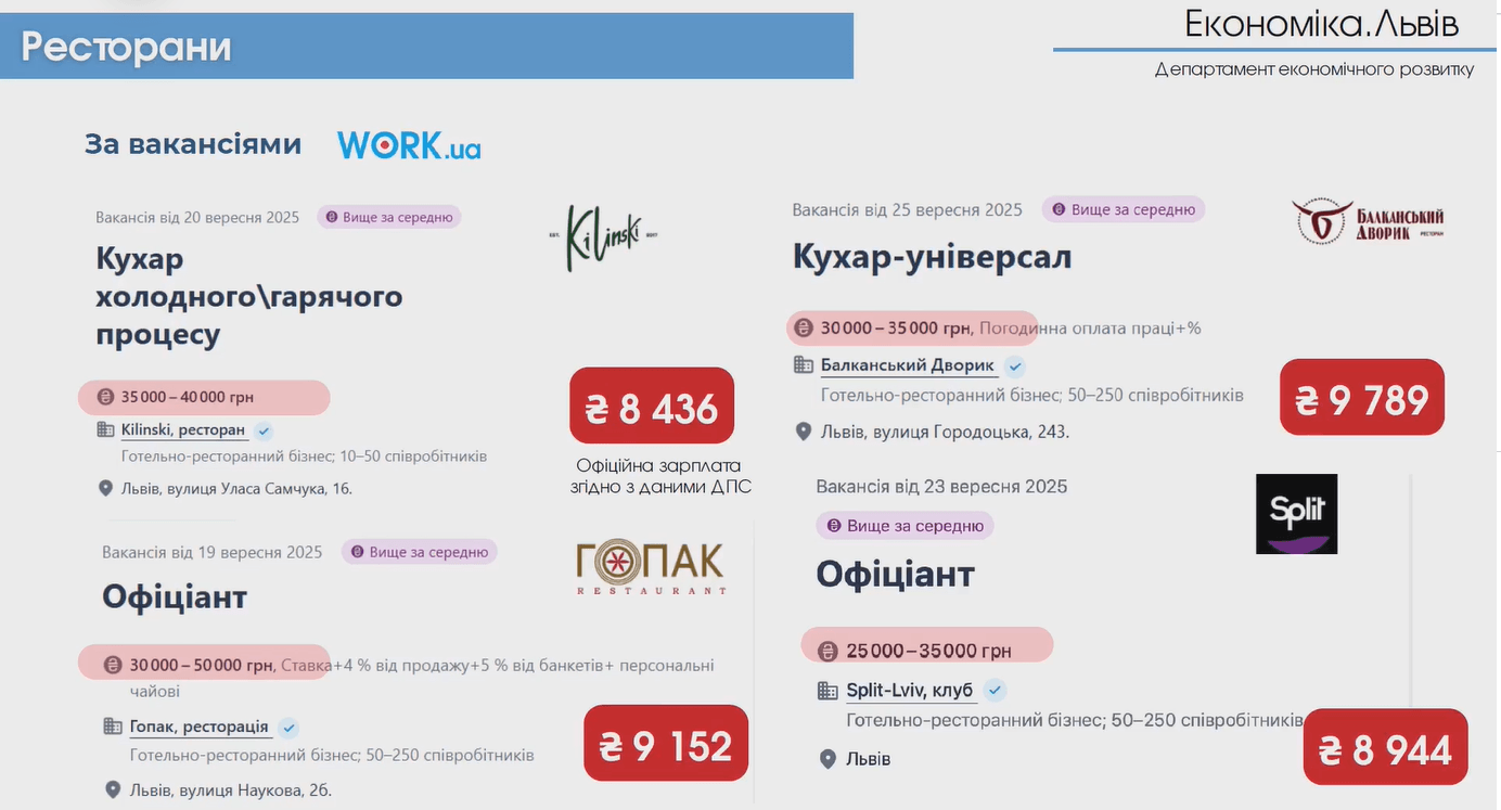 «Фактична зарплата, яку ми сьогодні фіксуємо у закладах ресторанного господарства, офіційно становить від 7779 до 14 536 грн. При цьому на work.ua вказують середню зарплату офіціанта 24 500 грн, а в категорії «готельно-ресторанний бізнес» – 26 500 грн», – сказала Інна Свитун, директорка департаменту економічного розвитку Львівської міської ради.