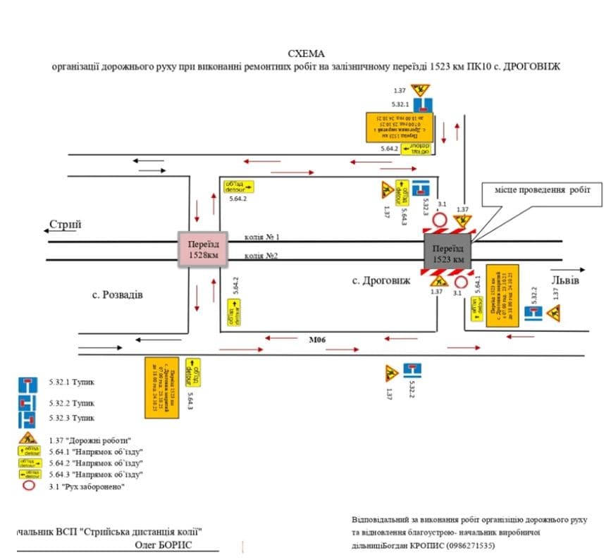 «Роботи проводитимуть з 07:00 год 23 жовтня до 18:00 год 24 жовтня. Об’їзд буде проводитись через переїзд 1528 км ПК3 з черговим працівником с. Розвадів. Тимчасові дорожні знаки для інформування учасників дорожнього руху будуть встановлені згідно з вимогами нормативних документів», – йдеться у повідомленні.