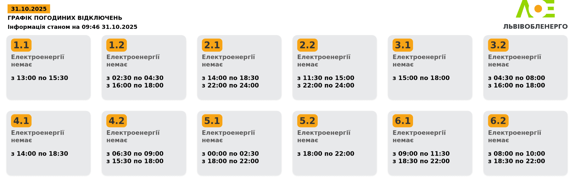 У Львові 31 жовтня діють графіки погодинних відключень електроенергії. Про це повідомили у «Львівобленерго» та оприлюднили черги відключень.