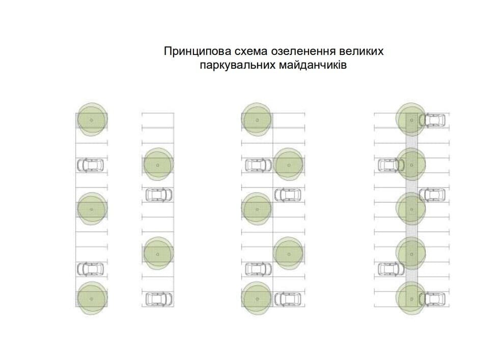 Для перпендикулярного паркування передбачено не менше одного дерева на кожні п’ять машиномісць, а для паралельного — на кожні три. Дерева мають сягати щонайменше 15 метрів заввишки.