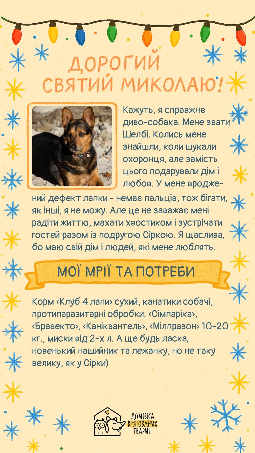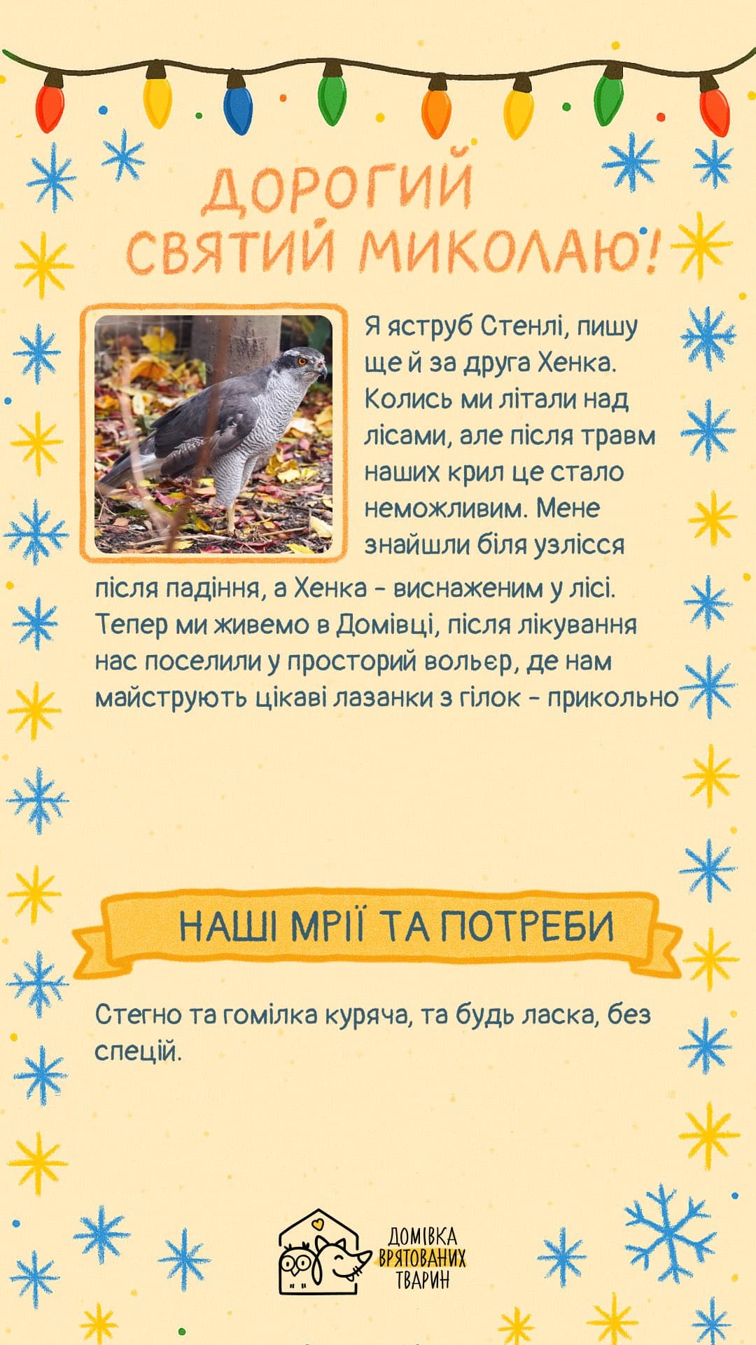 Працівники Домівки щодня опікуються сотнями тварин — забезпечують догляд, лікування та безпечні умови, а також організовують евакуацію з прифронтових територій. Попри щоденні виклики, команда не забуває про теплі традиції — щороку підопічні «пишуть» листи до Святого Миколая.