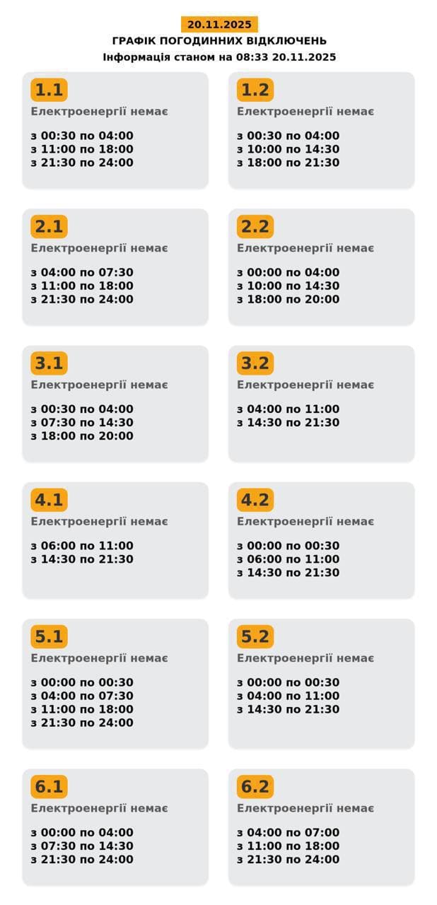 У Львові та області 20 листопада станом на 8:33 оновили графіки відключень світла. Про це повідомили у «Львівобленерго».