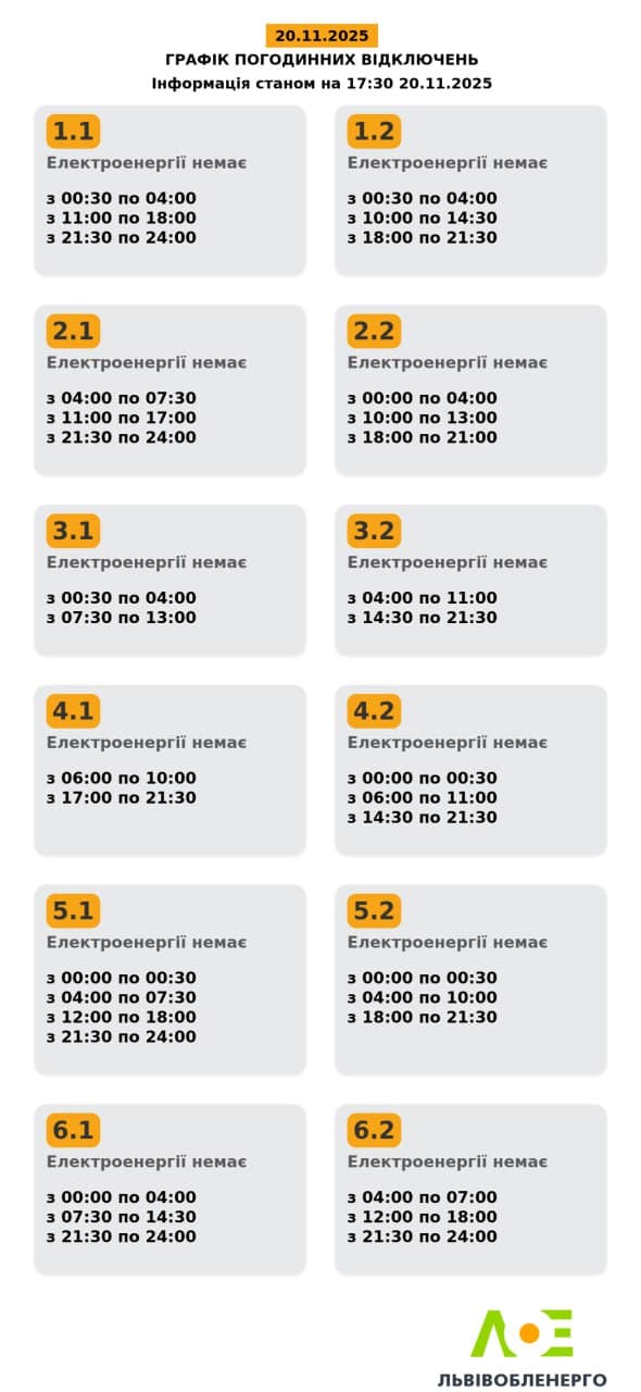 У Львові та області 20 листопада станом на 17:30 оновили графіки відключень світла. Про це повідомили у «Львівобленерго».