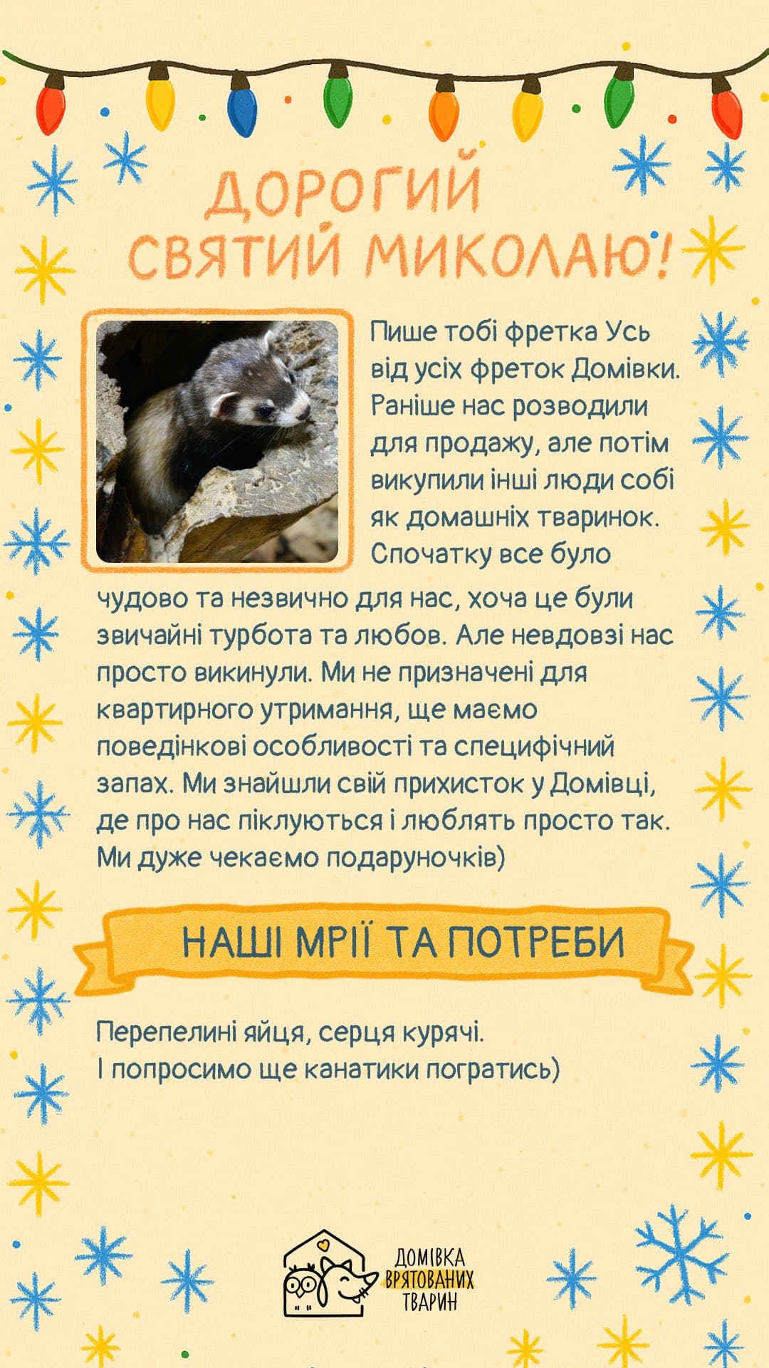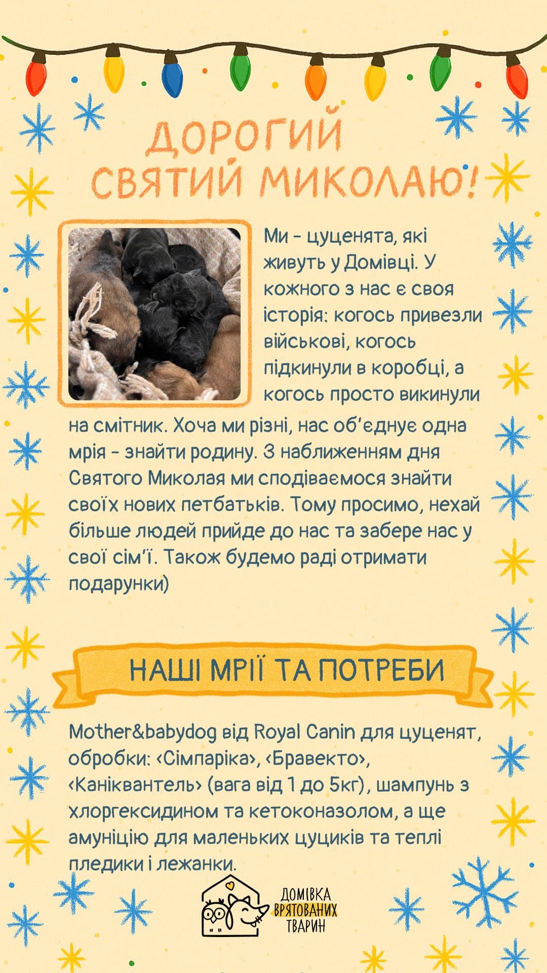 «Можливо, хтось скаже, що тварини не вміють писати, але ці аркуші доводять протилежне: вони подряпані кігтями, із плямками від носиків і шерстю. У кожному з них — щире прохання про щось дуже потрібне», — зазначають у Домівці.