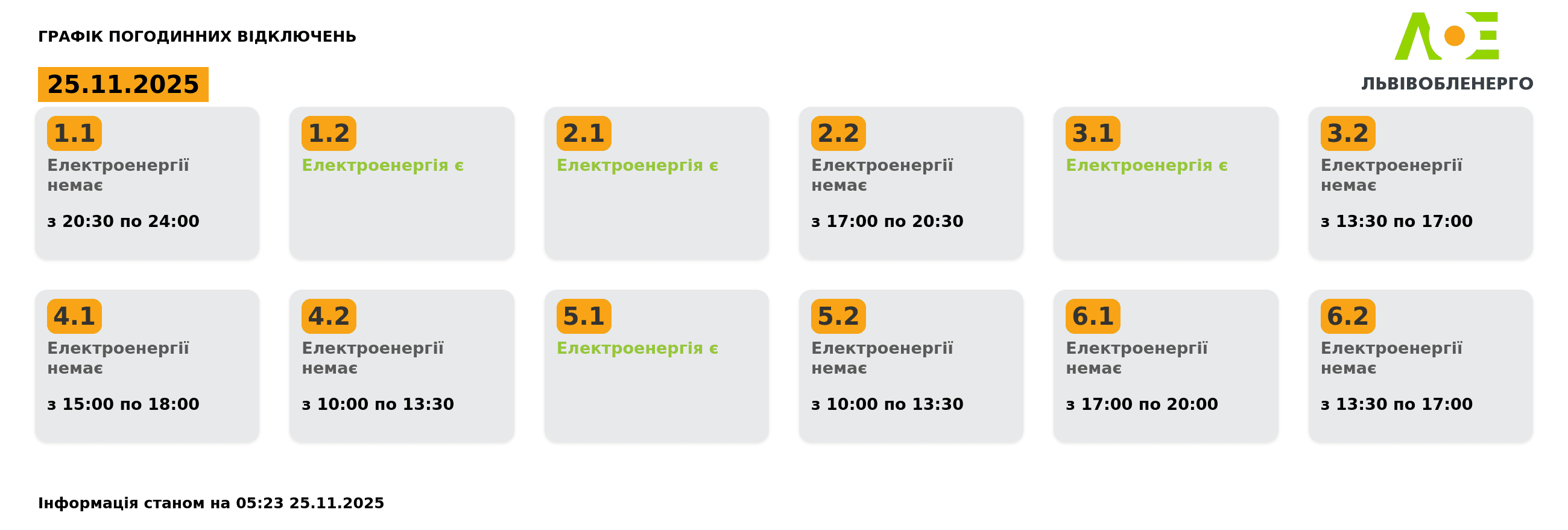 У Львові оприлюднили графіки відключення світла на вівторок, 25 листопада. Про це повідомили у «Львівобленерго».