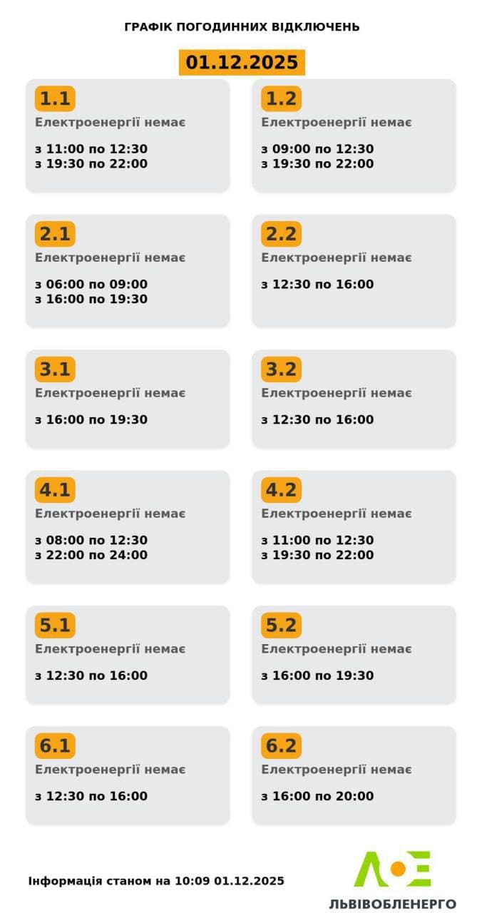 У Львові знову оновили графіки відключень світла на 1 грудня. У «Львівобленерго» опублікували нові дані станом на 10:09 год.