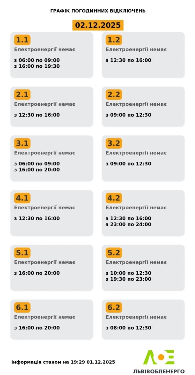 У Львові оприлюднили графіки відключень світла на вівторок, 2 грудня. Так, світла загалом у деяких групах протягом дня не буде по 6 годин.